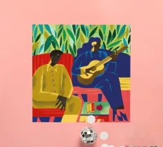 An intimate interior scene portraying two people, one dark-skinned and one light-skinned, seated at a vibrant yellow table, possibly sharing a meal or conversation. Green foliage is visible through a window behind them, adding to the warm and cozy atmosphere.