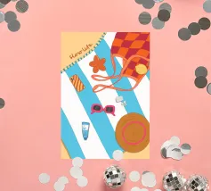 A fun collection of summer items is laid out on a blue background, including ice cream, french fries, sunglasses, flip flops, and a sun hat.