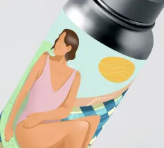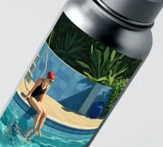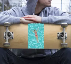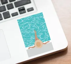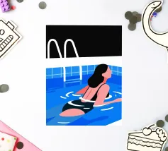 Minimalist vector artwork depicting a solitary female figure in swimsuit centered in a serene swimming pool. Clean lines, soft hues, and tranquil composition evoke calm, introspection, and summer elegance—perfect for modern design and lifestyle visuals