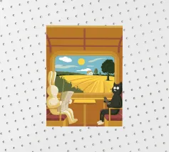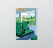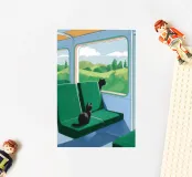 A view from a train window of a green, rolling countryside landscape. The scene is a peaceful, contemplative, and beautiful depiction of travel and the quiet joy of watching the world go by.