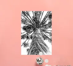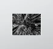 Black and white view from below of a forest of very tall trees.