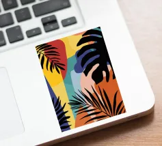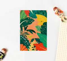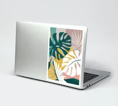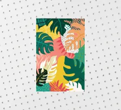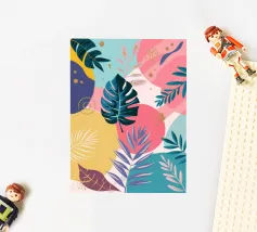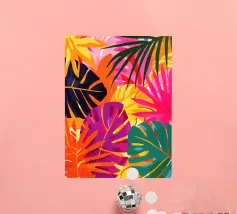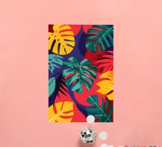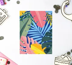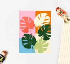 A sophisticated composition combines blocks of tropical leaf patterns with solid color fields and geometric shapes. The patchwork design in shades of blue, pink, and green creates a balanced and stylish piece that is both modern and natural.