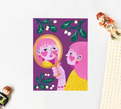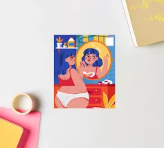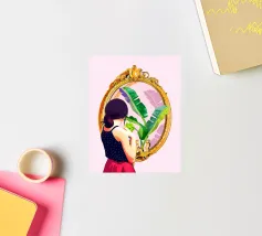 This artwork shows a person with blonde hair looking into a vanity mirror. The background is filled with floral wallpaper, and the vanity table is adorned with various items, creating a nostalgic and intimate scene.