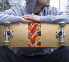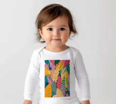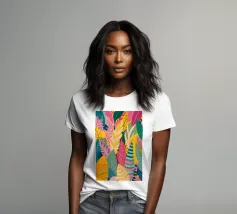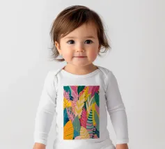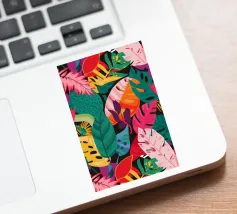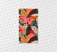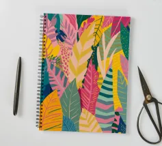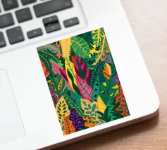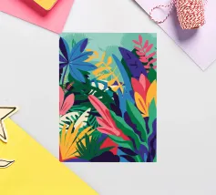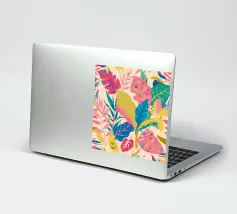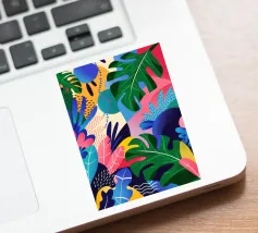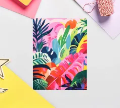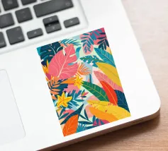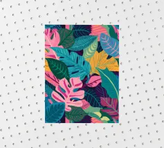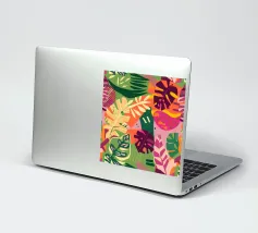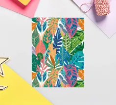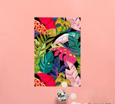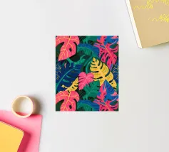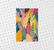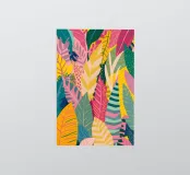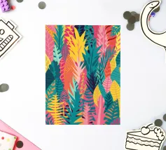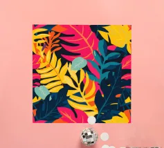 A dense, colorful pattern of overlapping tropical leaves and abstract shapes in bright hues of yellow, pink, blue, and green, creating a joyful, energetic design.