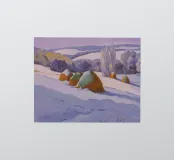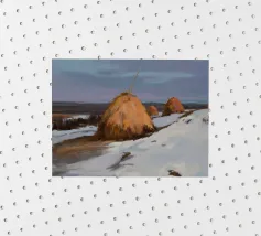 A stark yet beautiful winter landscape centered on two prominent haystacks standing resiliently in a vast, snow-covered field, with a line of bare trees in the distance under a muted, overcast sky.