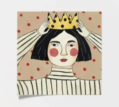 This painting shows a person with short dark hair styled in a wave, wearing a retro-patterned dress with circles and diamonds in shades of pink, brown, and beige. The background is a plain light beige color.