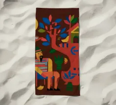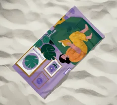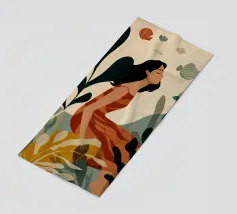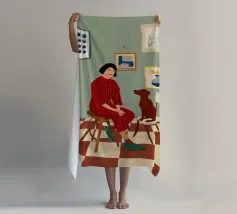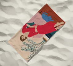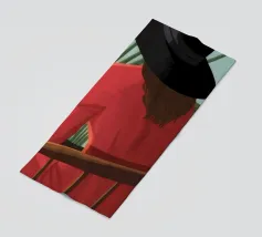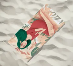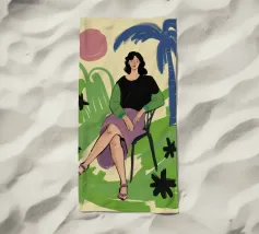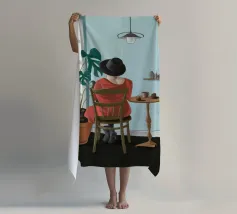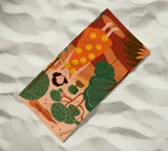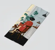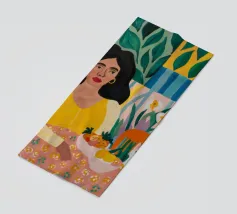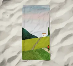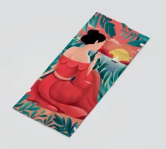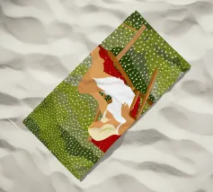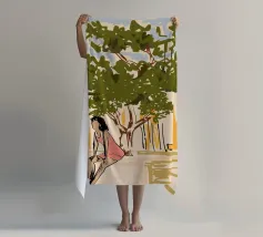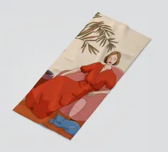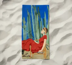 An illustration of a woman in a red dress, sitting in a field with an olive tree and a windmill in the background. The scene is a serene, picturesque, and timeless depiction of a peaceful day in the countryside.