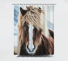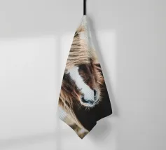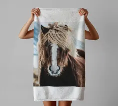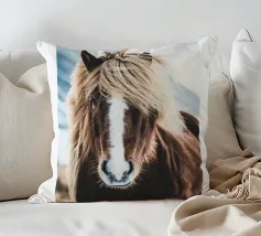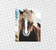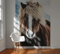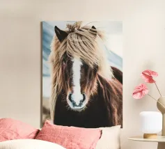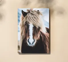 A fascinating portrait of an Icelandic horse in the harsh winter landscape that captures the untamed beauty and power of nature. The contrasting brown tones of the coat and the white blaze impressively emphasise the proud animal. Ideal for nature and horse lovers who want to bring a piece of Nordic wilderness into their living spaces. Perfect for murals, mugs, cushions and other home accessories - this motif adds a rustic yet elegant touch to any room.