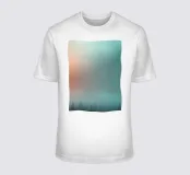 Soft hues of orange and teal blend seamlessly, creating a calming backdrop. Silhouettes of trees emerge from the mist, embodying a serene early morning atmosphere.