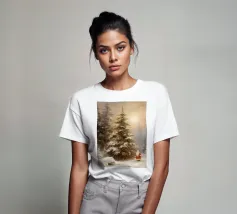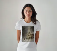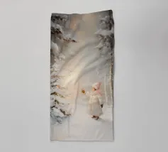 Peaceful winter scene featuring a child in a white coat and pink scarf reaching towards a small, illuminated snow-covered tree, surrounded by tall, snowy trees.