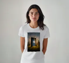 This surreal artwork portrays two robed figures walking hand-in-hand through an ancient stone archway toward a glowing sky of pink and violet hues. Above them floats a radiant geometric eye, symbolizing awareness, mystery, and deeper understanding. The blend of historic architecture, soft sunset colors, and symbolic iconography creates a scene filled with meaning and imagination. Ideal for fans of spiritual art, surreal storytelling, and thought-provoking wall décor that inspires curiosity and reflection.