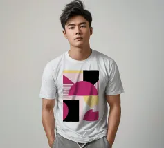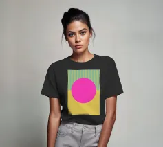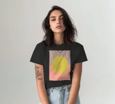 Embrace the aesthetic of modern design with this striking geometric abstract art print. Featuring a captivating composition with color blocks in pink, yellow/orange, and black, separated by bold diagonal lines. A large dark red/brown oval shape is layered over these sections. This artwork uses simple geometric forms and strong color contrasts to create a visually engaging abstract piece, exploring the interaction of shapes and hues. This high-quality digital art file boasts a stunning 7000x5000 pixel resolution at 300 dpi, ensuring exceptional detail and clarity for your poster print. A perfec