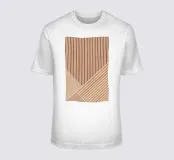 Striking geometric design featuring white parallel lines arranged in various orientations, creating triangular and trapezoidal shapes against a brown background, resembling a wooden texture.
