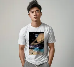 A large planet adorned with rings floats above a barren terrain, while distant celestial bodies illuminate the starry sky. Shadows of mountains add depth to the surreal setting.