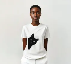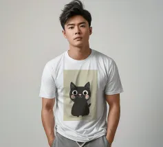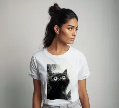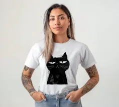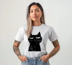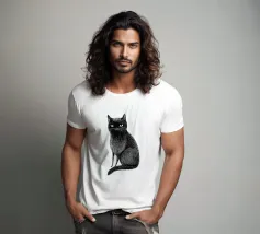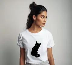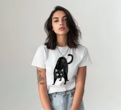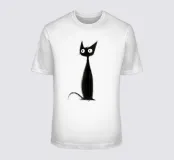 A minimalist black-and-white illustration of a sleek, black cat with exaggerated wide eyes and sketchy features. The cat's whimsical and abstract design adds a playful, artistic touch.