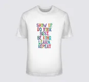 Embrace growth with this vibrant typography art print. "Show Up Do Your Best Be Kind Learn Repeat" comes alive in rainbow watercolour lettering on white. It's an engaging piece radiating positivity, perfect for offices, bedrooms or studies. A colourful reminder of self-improvement, it brightens any space and prompts positive habits. Let this print inspire consistent effort, kindness and learning in your daily life.