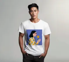This artwork features a person with short blonde hair wearing a floral jacket and holding a book. The bright yellow background enhances the chic and stylish essence.