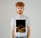Piles of shiny coins are arranged in varying heights, surrounded by scattered coins, all illuminated against a black background, creating an eye-catching contrast.