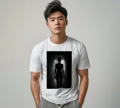 A woman poses with her back turned, showcasing the contours of her spine and shoulder blades. The black and white tones enhance the beauty of her silhouette and create an artistic atmosphere.