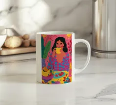 An overhead view of a simple breakfast setting on a red and white checkered tablecloth, with a cup of coffee and a tree branch. The minimalist composition has a serene, graphic, and classic cafe feel.