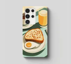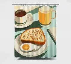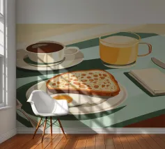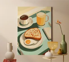 This detailed motif captures the quiet beauty of a simple breakfast moment: a cup of black coffee, a glass of orange juice, a piece of bread and a boiled egg - arranged on a lovingly laid table. The warm colour palette and illustrative style radiate cosiness, tranquillity and an everyday feel. Perfect for kitchens, cafés or dining areas, this picture brings a feeling of deceleration and enjoyment. Especially for fans of vintage style, culinary aesthetics or people looking for magic in the everyday.
