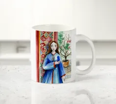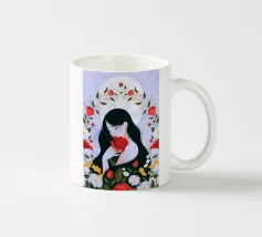 A painting of a person with bright red hair and butterflies around the head, wearing a floral-patterned dress.