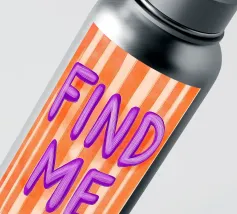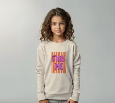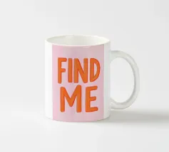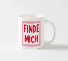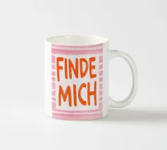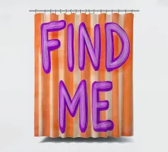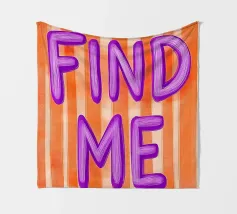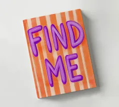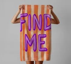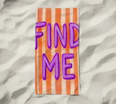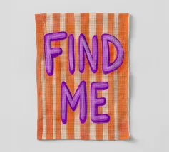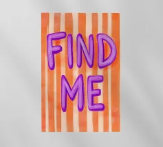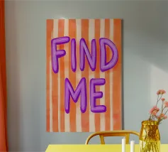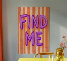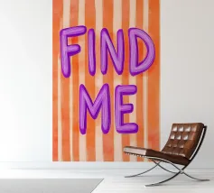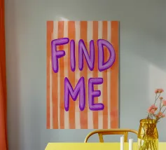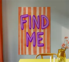 In bright shades of orange and purple, this art print "Find me" expresses the longing for love and self-discovery in large letters and stripes. The romantic typography frames the search for a partner and being together. Ideal for summer, the design playfully captures the essence of relationships.