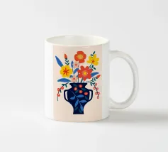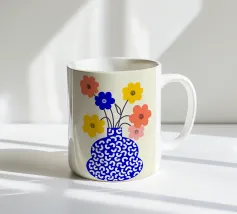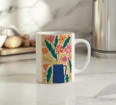 This cheerful floral motif shows a stylised blue vase filled with colourful flowers in orange, red, yellow and pink, framed by a warm coral tone. The design radiates joie de vivre and harmony and is perfect for wall murals, cushions, mugs, mobile phone covers and more. Ideal for anyone who loves a fresh, modern aesthetic and wants to brighten up their home with colourful, natural accents. This timeless floral arrangement will suit any room and any style of home.