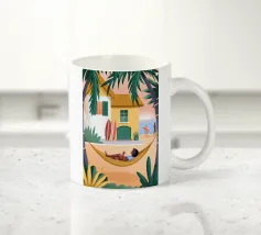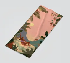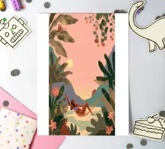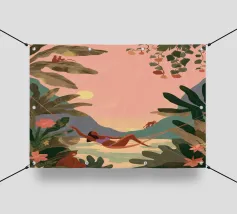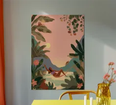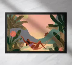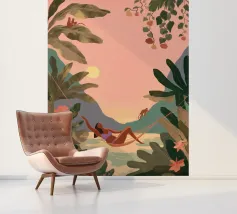 Bathed in the hush of a peachy sky, she floats in a hammock strung between palms, weightless as the day slips quietly into dusk. Monkeys perch and play, blooms lean in close, and the whole jungle hums with the comfort of doing absolutely nothing. It’s a moment made only of sunlight, laughter, and stillness — held gently in the arms of paradise.