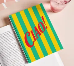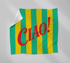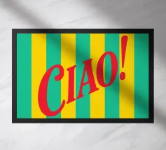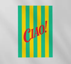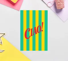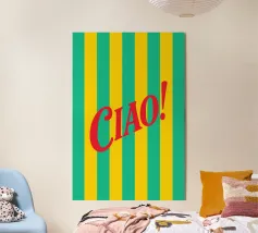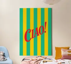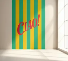 Playful pop art poster with Italian charm: the red "CIAO!" jumps out at you on cheerful stripes in yellow and turquoise. A stylish statement for the kitchen, hallway or office - ideal for anyone who wants to say hello (or goodbye) to life with a wink. This graphic combines retro flair, summer colours and typographic power.