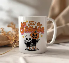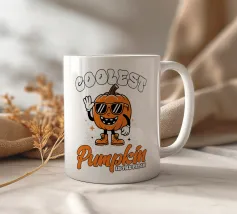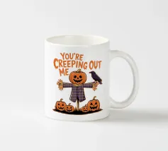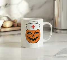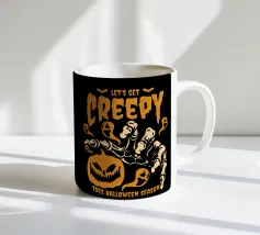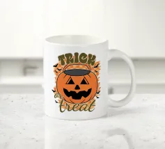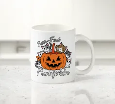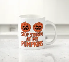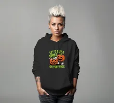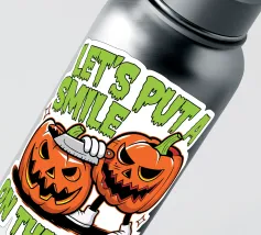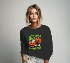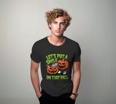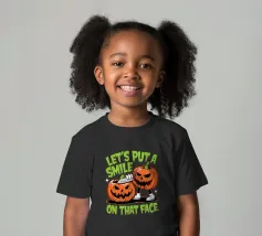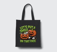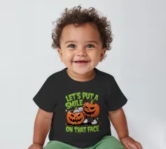 Two mischievous pumpkins with menacing grins . The phrase "Let's put a smile on that face" is displayed in bold, playful letters.