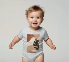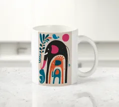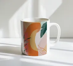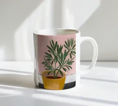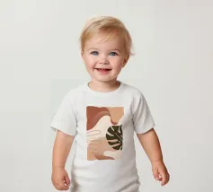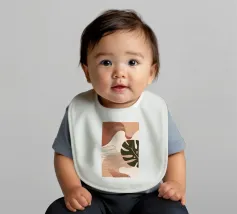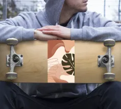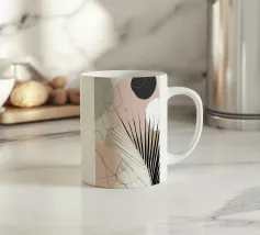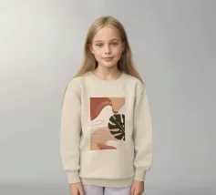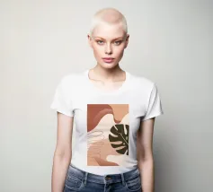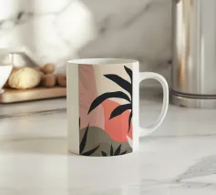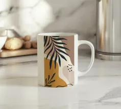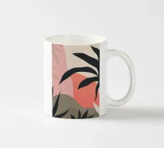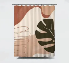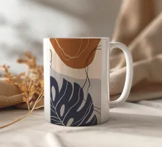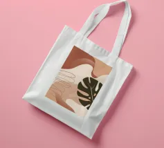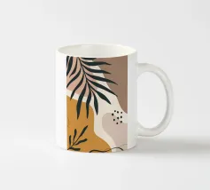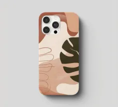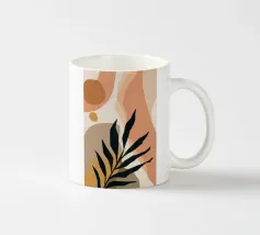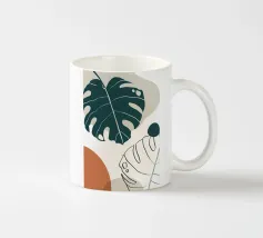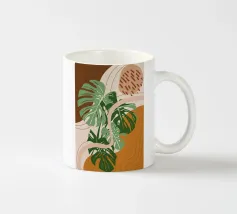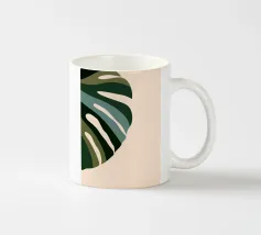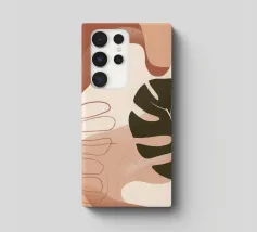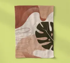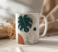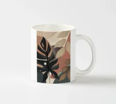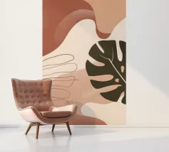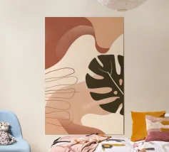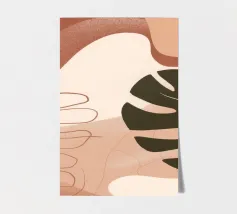 The image features an abstract illustration with a large black monstera leaf and a hand outline. The background consists of soft, flowing shapes in shades of beige and brown, creating a harmonious and organic feel.