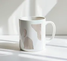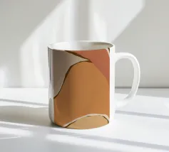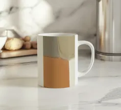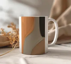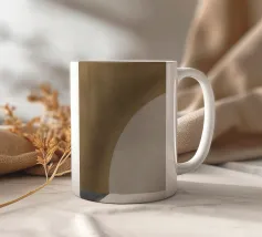 Soft, flowing shapes in earthy tones overlap to create an abstract design. The composition uses a palette of beige, brown, and gray, giving a calming and harmonious effect.