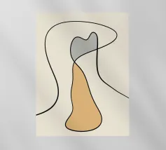 Abstract geometric lines and shapes create a minimalist composition with neutral tones. Curved black lines outline two distinct sections, one filled with gray and the other with beige.
