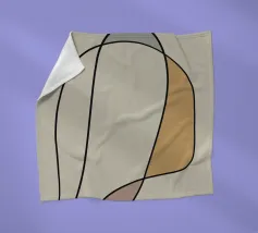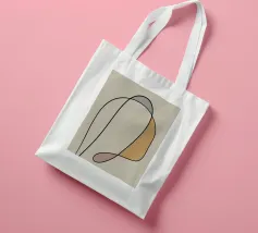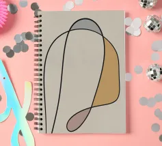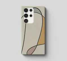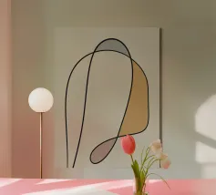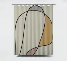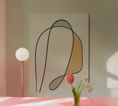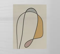 Abstract lines and shapes intertwine in a minimalist composition, featuring soft hues of gray, beige, and pink. The background is a subtle off-white, allowing the curving lines to stand out.