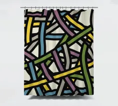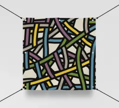 A variety of thick and thin lines crisscross and overlap each other against a light background, creating an intricate pattern. Colored segments in shades of blue, green, yellow, and purple add a vibrant contrast to the black lines.