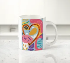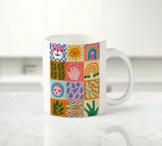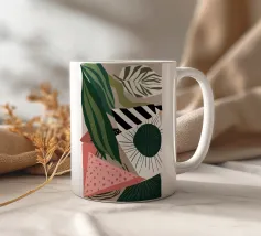 A modern, abstract composition featuring a patchwork of various patterns and shapes. Elements include organic leaf like forms, geometric grids, and abstract textures in a muted palette of pink, black, and beige, reflecting a bohemian, eclectic style.