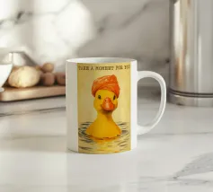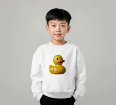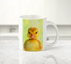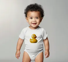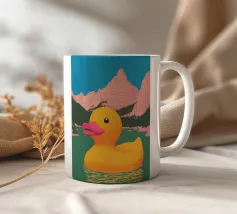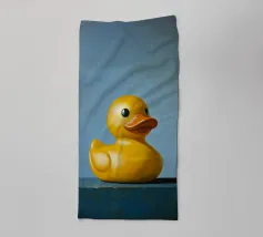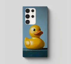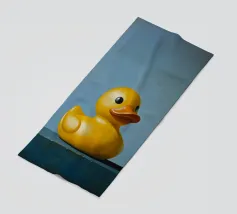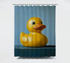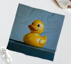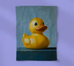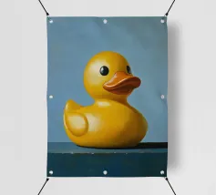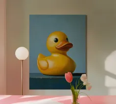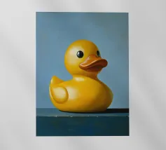 A highly detailed and realistic illustration of a bright yellow rubber duck sitting against a soft blue background. The glossy finish and vibrant colors highlight its cheerful and playful character.