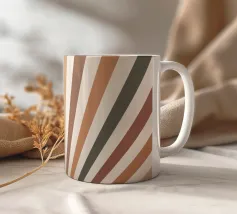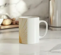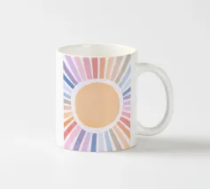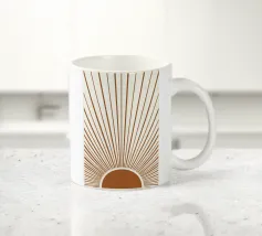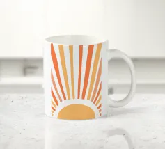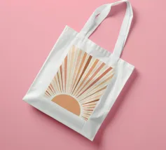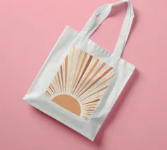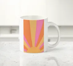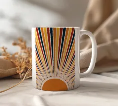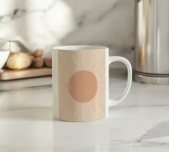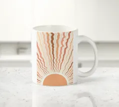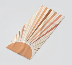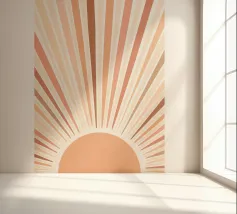 Radiating lines in soft earth tones burst from a semicircle centrally positioned at the bottom, creating a sunburst effect. The design uses warm hues of peach, cream, and brown, adding a retro aesthetic.