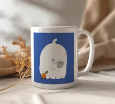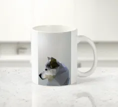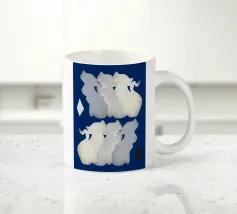 A white wolf appears to be emerging from a cloud of mist against a striking blue background. The portrayal of the wolf is soft and ethereal, with its details gently fading into the surrounding vapor.