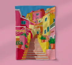 A steep, colorful stairway serves as a street in a Mediterranean town, flanked by bright yellow, orange, and pink buildings adorned with green potted plants.
