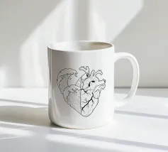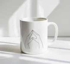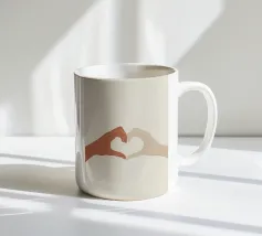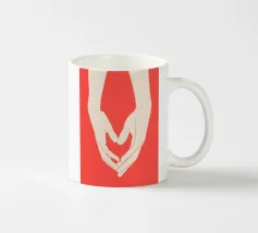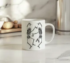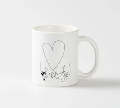A pair of skeletal hands forms a heart shape . The design juxtaposes the concepts of love and mortality.