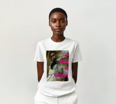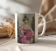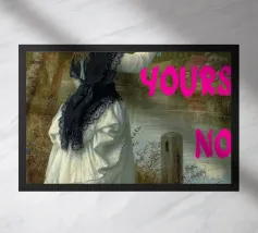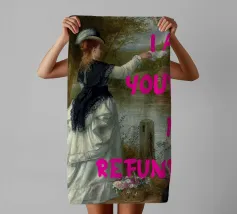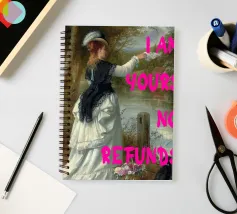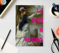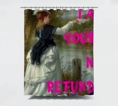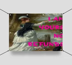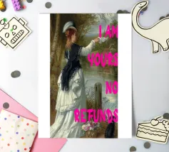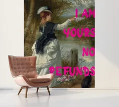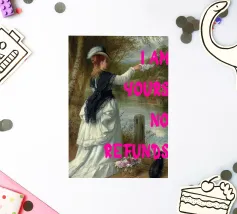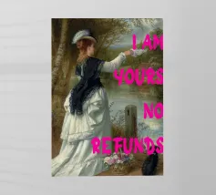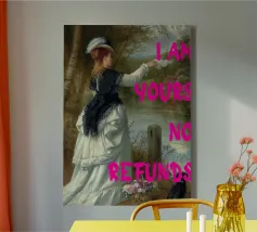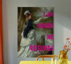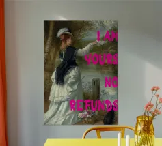 Make a commitment with a witty twist with "I Am Yours No Refunds." This captivating pop art print masterfully blends a charming classical scene with a contemporary, humorous declaration. It features an elegantly dressed historical figure, gracefully extending her hand by a serene body of water, a basket of flowers and a small dog at her feet. The bold, hot pink text "I AM YOURS NO REFUNDS" overlays the image, transforming the romantic setting into a playful yet resolute statement. Perfect for adding personality and a touch of lighthearted charm to any contemporary space. Crafted at an exceptio