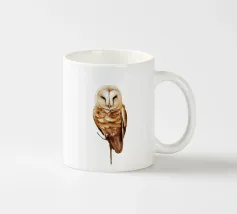 An oil painting of a funny and cute-looking owl. It is a light brown bird with big orange eyes. The owl's eyes are a little uneven which makes him look extra funny and sweet. It also looks a bit startled with its round eyes.