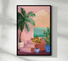 A tropical illustration in a Mediterranean setting. The bench invites you to dream away in this summery environment.