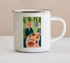 An intimate illustration capturing a quiet moment between two people sitting at a small table in a cafe. The warm, subdued lighting and their focused interaction create a narrative of conversation and connection, representative of modern social life.