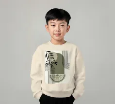 Abstract geometric shapes and curved lines create a harmonious composition in muted green and black tones. A botanical element adds an organic touch amidst the structured forms.