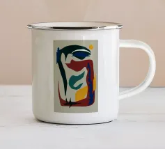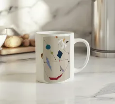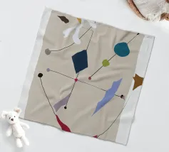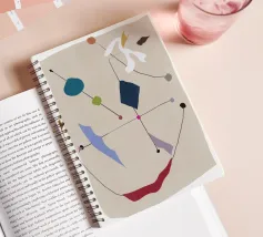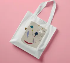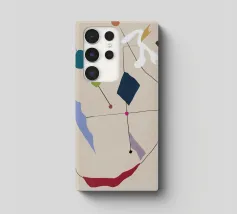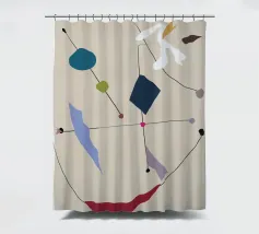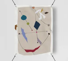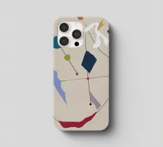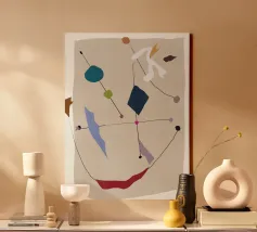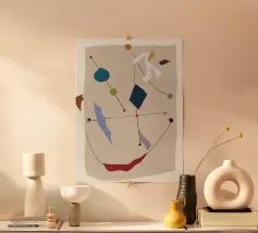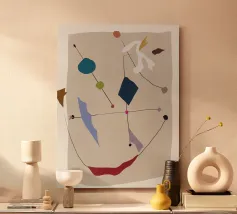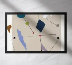 Abstract shapes in muted colors are interconnected by thin black lines, creating a dynamic composition. The design incorporates various geometric and organic forms, adding a sense of balance and movement.