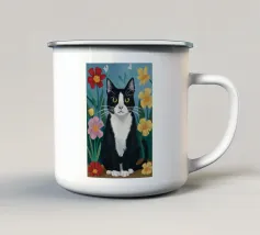 A black and white cat sits regally behind a large vase of flowers with bold, striped patterns, set against a pink curtain, creating a striking and charming still life.