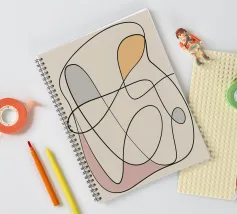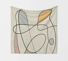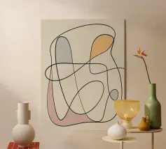 Curved black lines intertwine over a neutral background, forming abstract shapes filled with muted colors like orange, gray, and pink. The composition exudes a sense of fluidity and gentle movement.